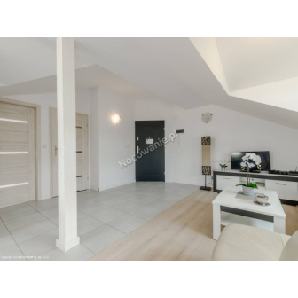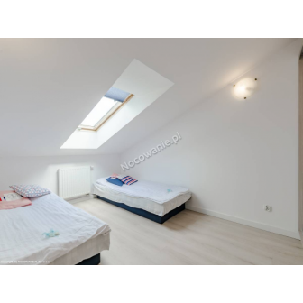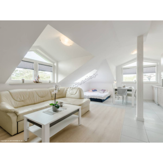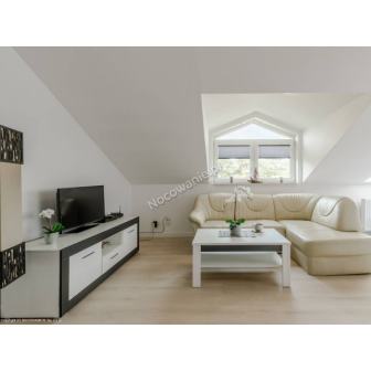 Apartament 2-pokojowy przeznaczony dla 6 osób z możliwością dostawki łóżeczka dziecięcego. Apartament składa się z przestronnego salonu podzielonego na 3 strefy: strefę rekreacyjną: wyposażonego w dużą rogówkę, stolik okolicznościowy, szafkę RTV i TV. Strefę sypialną: dwa wygodne łóżka 90 cm. Strefa kuchenna: W pełni wyposażona kuchnia w zabudowie (lodówka, 4 palnikowa płyta indukcyjna, zmywarka, okap, zlewozmywak z ociekaczem, czajnik elektryczny), stół z 4 wygodnymi krzesłami. Otwarty przedpokój z lustrem i miejscem na powieszenie kurtek, z osobnym wejściem do łazienki i zamykanej sypialni. Sypialnia wyposażona w komfortowe łóżko małżeńskie, dwudrzwiową zabudowaną szafę wnękową. Łazienka wyposażona jest w prysznic, komplet szafek w zabudowie z lustrem oraz umywalką nad blatową. Apartamenty są nowe, oddane do użytkowania VII 2016r. Z klimatycznymi skosami, w kolorystyce biało siwej, wysoki standard. Na oknach modne rolety przyciemniające, odbijające promienie słoneczne. Do każdego apartamentu jest możliwość dostawki łóżka dziecięcego oraz dostarczenia asortymentu dla małych dzieci i niemowląt tj.: przewijaka, nocnika, specjalnego kosza na pieluszki. Możliwość wykupienia śniadań lub całodziennego wyżywienia. Szczegóły nocowanienawydmie.pl zakładka POSIŁKI